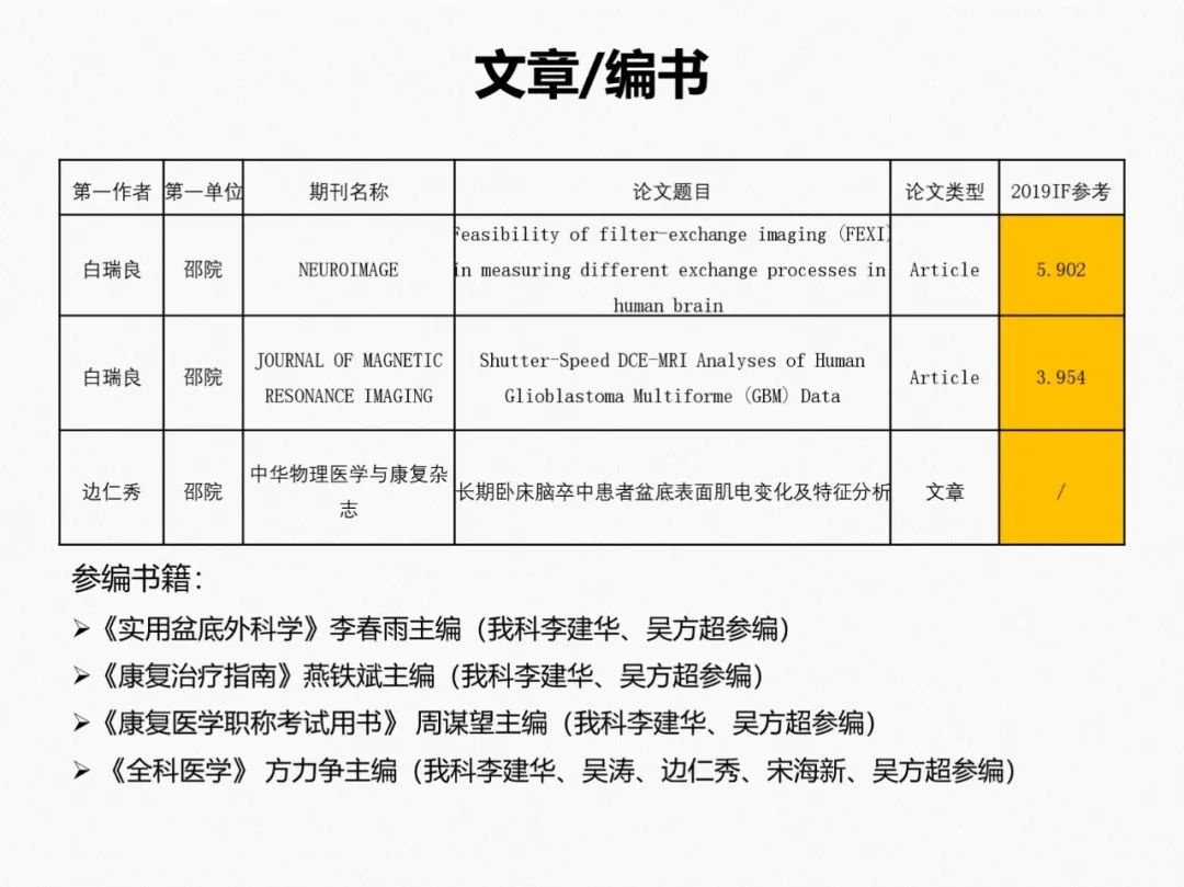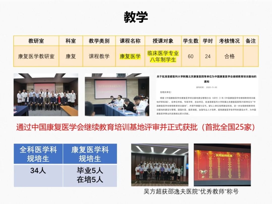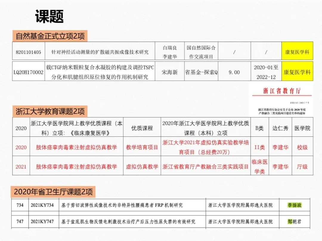 科室已发表文章150余篇,除一级核心期刊外,其中SCI文章15篇,IF>4.0的3篇,至今获得各类课题20余项,包括参与国家十三五课题1项,主持国家自然基金课题1项,浙江省科技厅重大专项1项,参与浙江省中医药管理局重大专项课题1项,主持浙江省自然基金3项,主持浙江省卫健委课题10余项,浙江省体育局课题5项,科研经费支助250余万,获得发明专利2项(康复训练机器人、表面肌电图设备),获得浙江省科技进步二等奖1项,省卫计委科技进步三等奖2项。主编康复医学参考书3本,参编康复医学教材10余本。科室现有中华医学会物理医学与康复学分会常委1人,中华医学会物理医学与康复学分会青年委员会委员1人,中国医师协会康复医师分会常委1人,浙江省医学会物理医学与康复学分会主委1人,浙江省医学会物理医学与康复学分会委员2人,浙江省医师协会康复医师分会副会长1人,中国康复医学会运动疗法专业委员会候任主委1人,中国康复医学会康复护理专业委员会委员1人,浙江省医学会物理医学与康复学分会康复护理学组组长1人。科室每年举办康复专科特色技术学习班如表面肌电图、肉毒毒素、肌骨超声、盆底康复10余期,招收学员400余名,每年科室进修生来自全国各地约70余名,康复治疗技术专业实习生140余名。学科自2014年至今连续获得复旦大学医院管理研究所《全国最佳声誉专科排行榜》康复医学专业华东地区第4位,浙江省内排名第1位。
