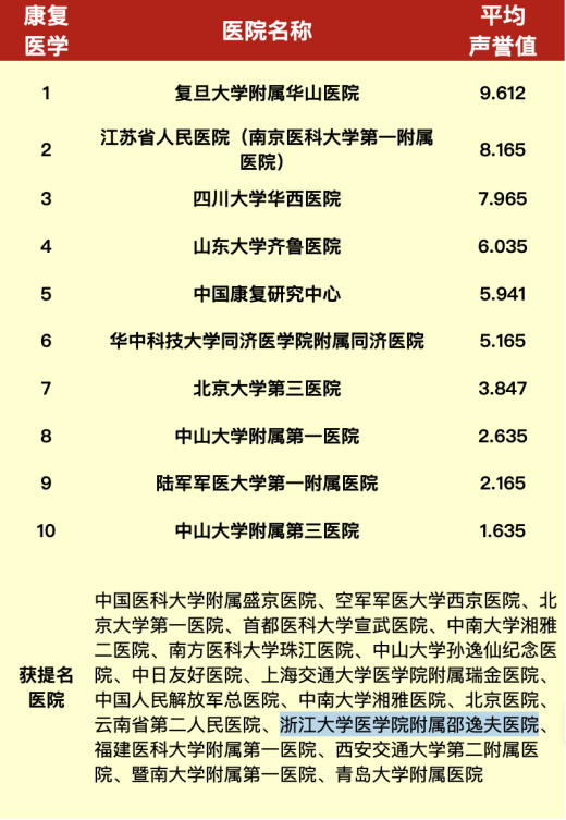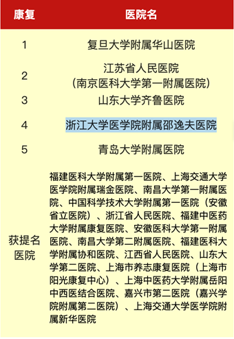 2 浙大邵逸夫医院康复医学科在复旦排行榜:连续6年获得全国榜提名;华东地区第4