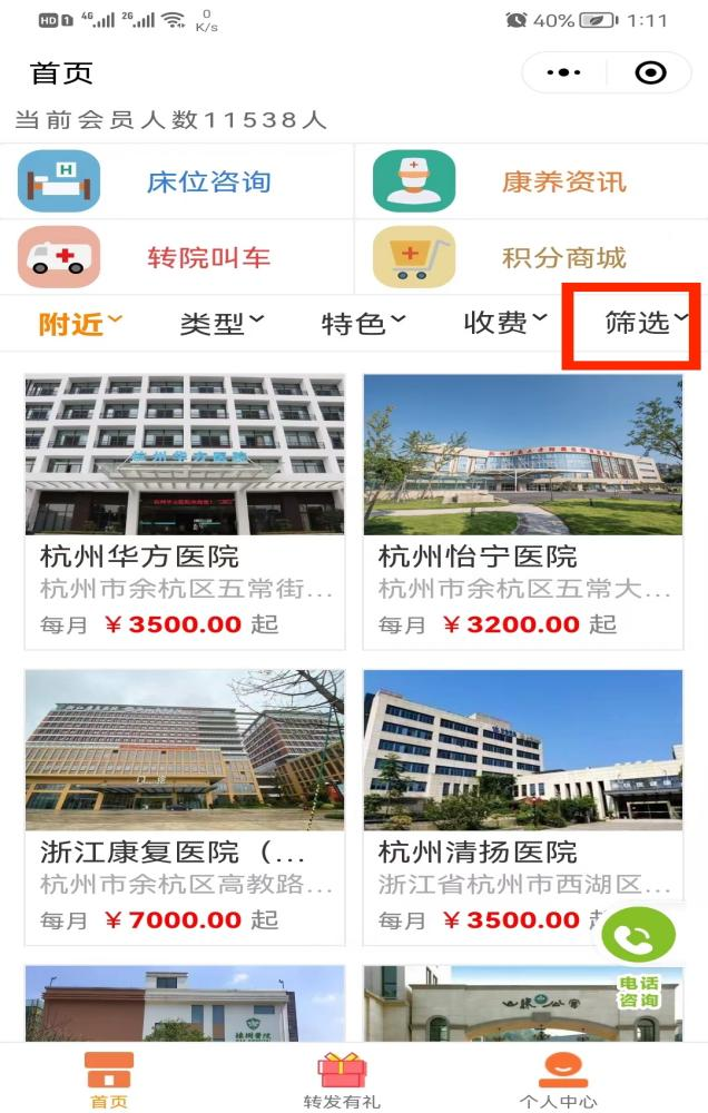 3、进入“智慧康养小程序”主界面,点击“筛选”按钮