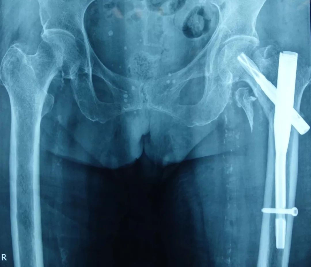 这是一个股骨粗隆间骨折的老年患者,和其他人一样,也是走路时不小心摔倒导致骨折,骨折移位明显,而且有较大的骨碎块。
