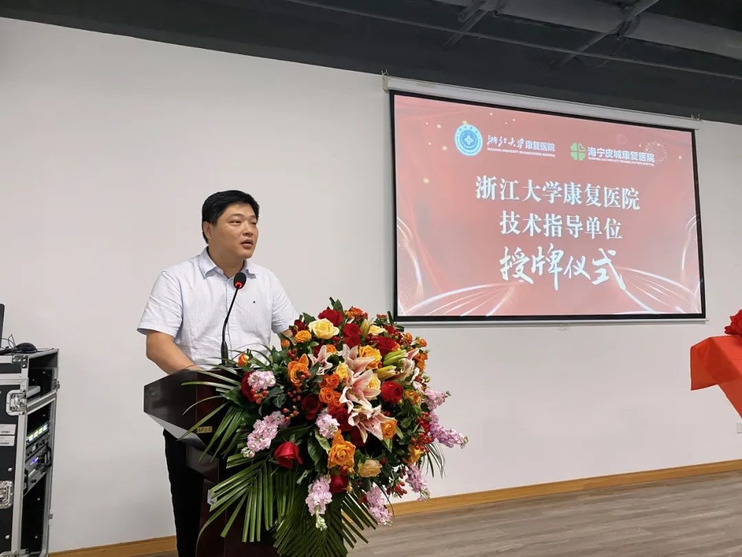 仪式开始,浙江大学康复医院副院长张庚向大家宣读授权书。浙江大学康复医院将充分发挥学科优势,积极开展对海宁皮城康复医院的技术指导和支持,帮扶医院学术和技术水平的提高。