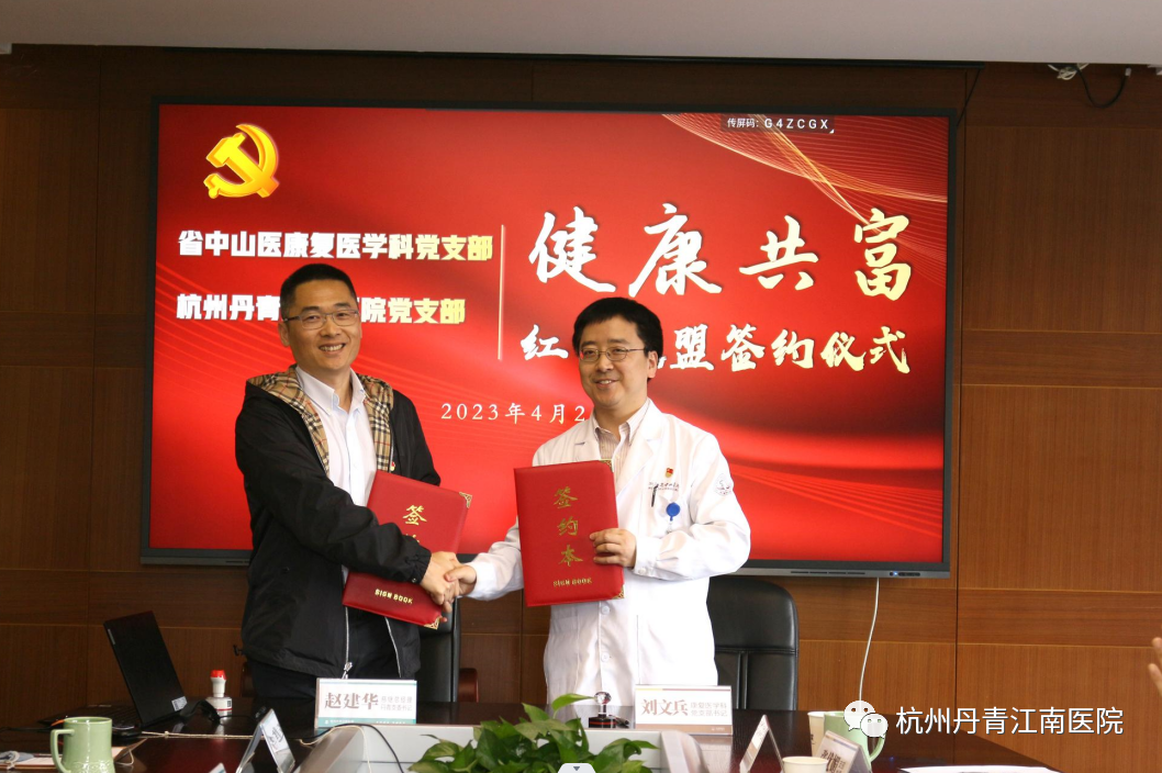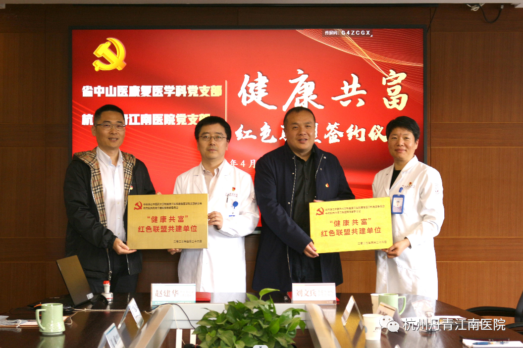 4月26日上午,中共浙江中医药大学附属第三医院康复医学科支部委员会与中共杭州丹青江南医院支部委员会在浙江省中山医院隆重举行“健康共富”红色联盟签约仪式。