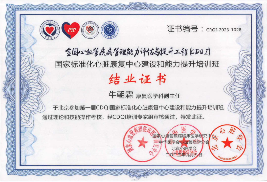 经过严格的培训及考试,杭州丹青江南医院牛朝霖主任、牛秀芬主任、辛航飞主任顺利拿到CDQI国家标准化心脏康复中心建设和能力提升培训班结业证书。