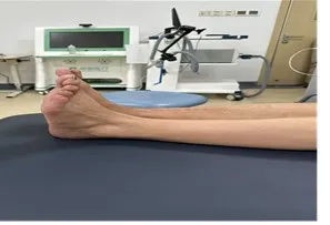 其次,在此基础上增加运动疗法,通过对踝关节周围向心性按摩促进血液回流,对发生粘连的踝关节进行松解,从而达到改善关节活动度的目的,并让其在股四头肌训练椅上锻炼腿部力量。
