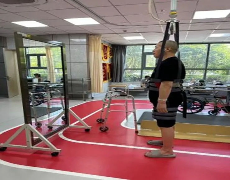接着,章斌治疗师修订下一步目标计划,将重点放在站立训练上。运用天轨对王师傅进行实时减重,通过天轨来减轻体重对患侧腿部的压力,让王师傅逐渐适应患腿用力。