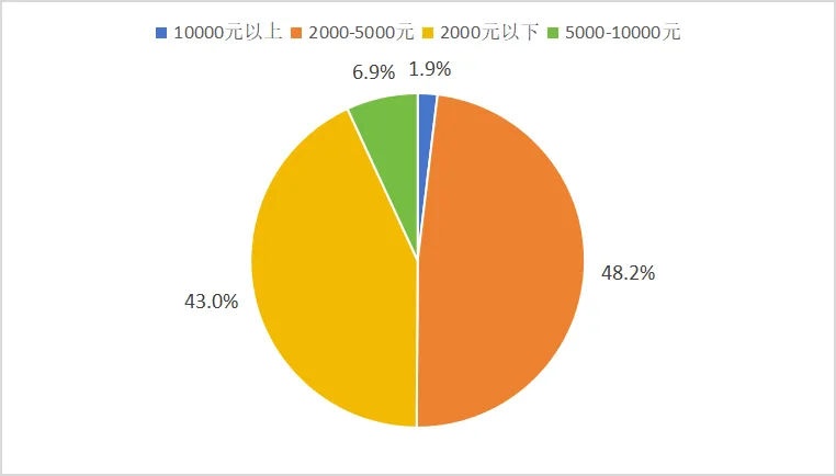 养老机构收费主要包括住宿费、餐饮费和护理费用。问卷结果显示:83.7%消费者居住1人间或2人间,比较舒适。48.2%养老机构住宿费用为2000-5000元/月;其次是2000元/月以下,占比为43%。消费者对住宿费价格的总体评价较满意,评价8分以上的占比为92.4%。