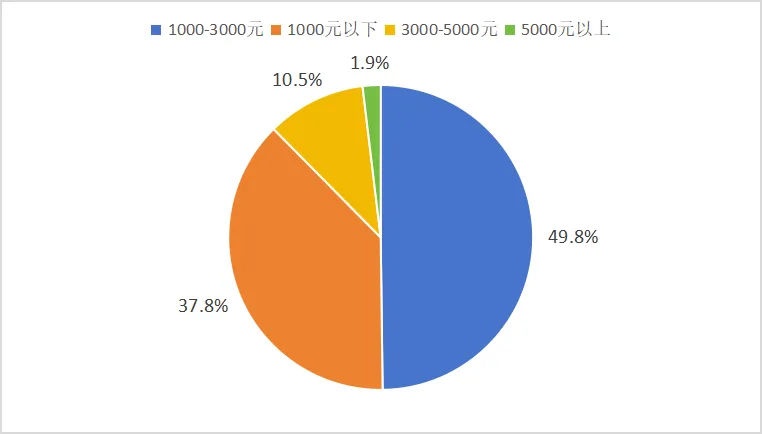49.8%养老机构护理费用为1000-3000元/月;其次是1000元/月以下,占比37.8%,3000-5000元/月的护理费用占比10.5%。消费者对护理费价格的总体评价较满意,评价8分以上的占比为95.1%。