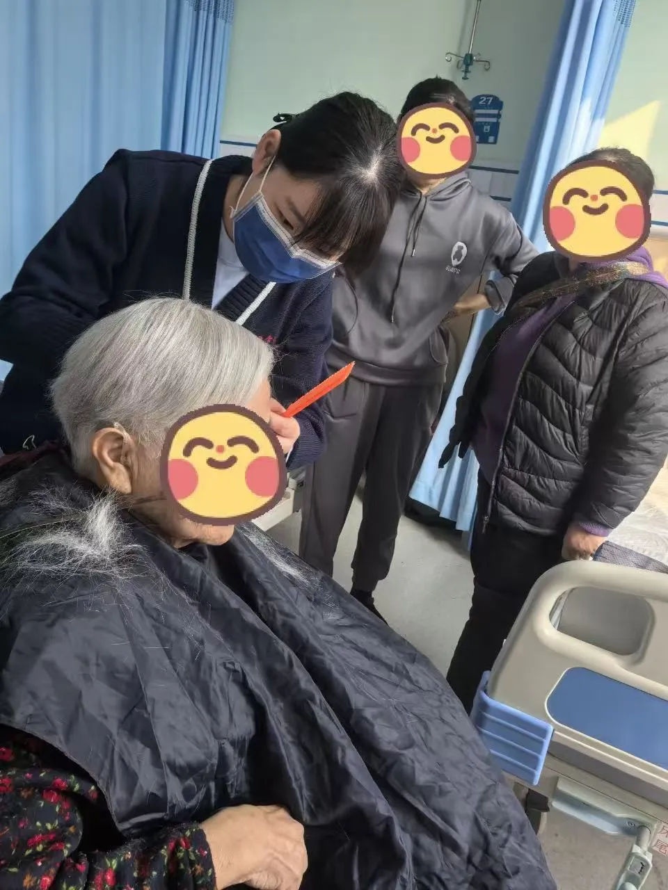 老年医学科综合病区护理团队通过日常一点一滴用心去关爱和帮助每一位老年患者,为他们协助进食,梳头按摩,定期洗头剪发,协助如厕,修剪指甲等暖心服务。这些亲情般的护理与服务温暖了老年患者的身心。