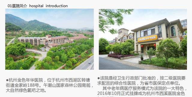 杭州金色年华医院是卫生行政部门批准开设的一家综合性医院,位于杭州金色年华金家岭退休生活中心和杭州金色年华老年公寓内部,医院共设有50张床位,可实际开放120张。医院地理位置优越,位于杭州市西湖区转塘街道金家岭188号,午潮山国家森林公园南麓,大自然绿色氧吧之地。